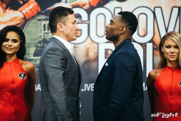 試合前のイベントでフェイスオフするゴロフキンとロールズ(c)DAZN