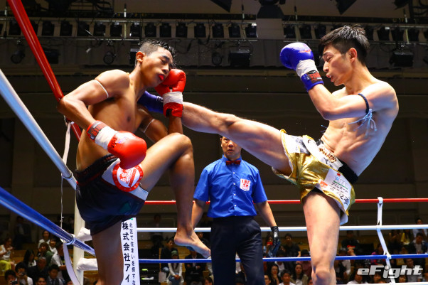 ハイキックをヒットさせる小嶋(右)