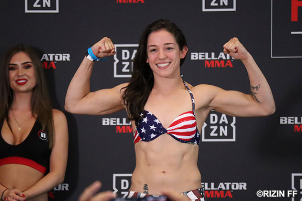 リンジーが割れた腹筋と筋肉で太い胴を披露=前日計量