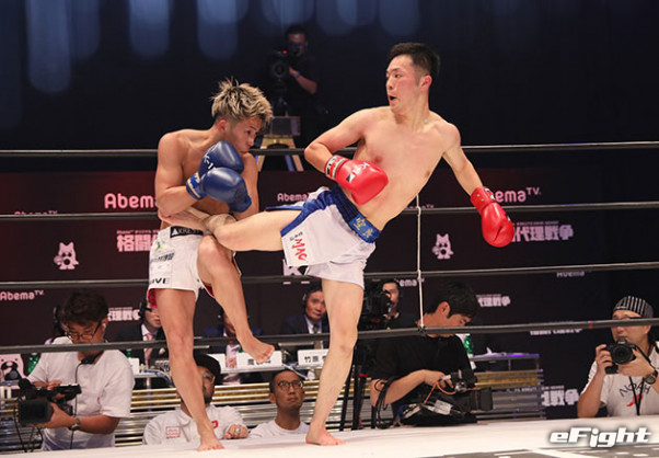 後ろ蹴りで応戦する水津(右)