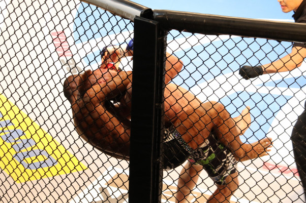 一瞬のスキを突いた手塚(左)が高木の首を取りバックチョークを決める