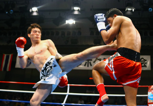強烈な左ミドルを蹴り込む江幡(左)