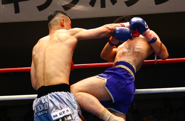 小原のヒザに右ストレートを合わせた斗吾(左)
