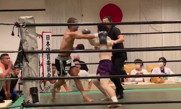 島野(左)はカウンターの右ストレートでスンボムのマウスピースを吹き飛ばす