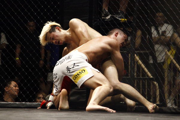 獅庵をすくい上げるようにタックルする三村(手前)
