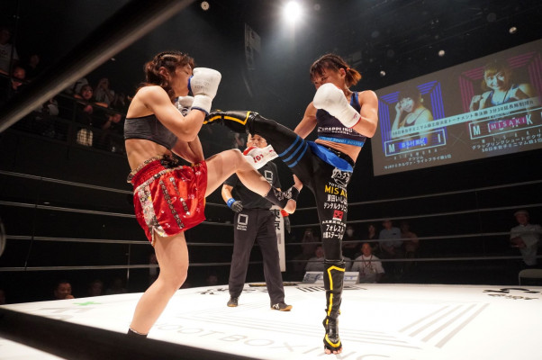 パンチと鋭い蹴りで前に出るMISAKI(右)