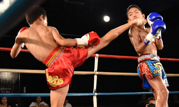 曽我の右ハイがヒットし、ホヨーン(右)はダウン