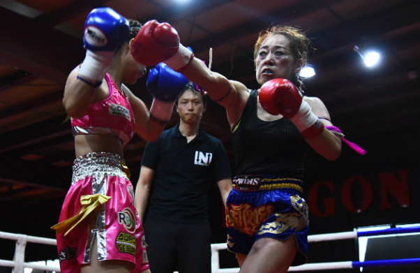 有里(左)との激しい打ち合いを制した魔由美(右)