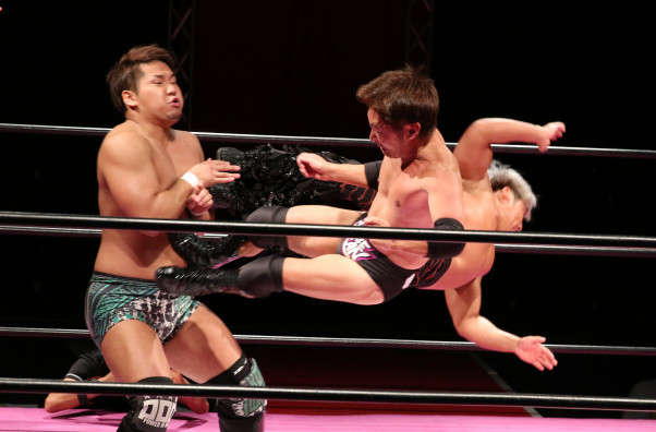 小柄ななべと島谷がダブルでドロップキックを見舞う