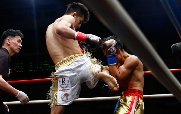 飛びヒザを見舞う鈴木(左)