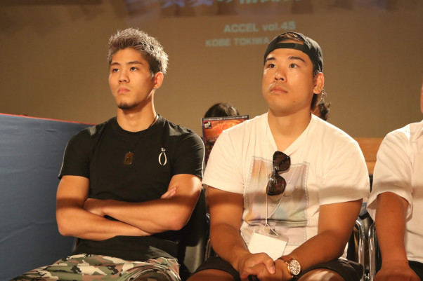 師の試合を見守る長島"自演乙"雄一郎(右)。左はRISEでも活躍するアクセル元王者の原口健飛