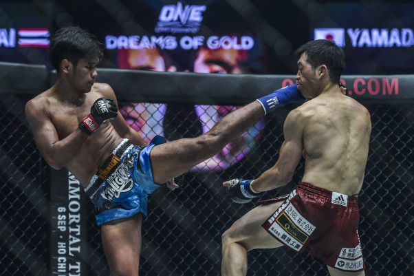 ムアンタイ(左)は左のミドル、ハイで健太のバランスを何度も崩す