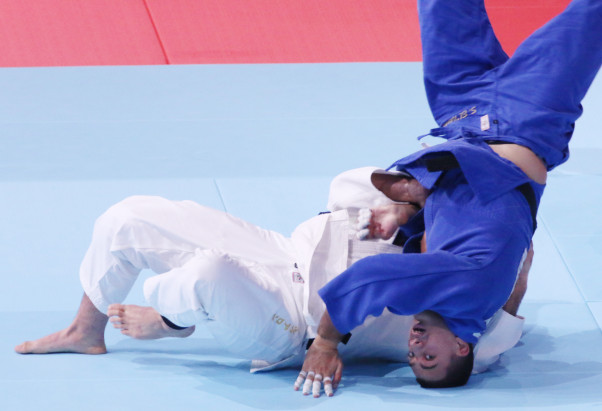 ウルフ(白)が帯取り返しで相手を真っ逆さまにして転がす。相手は驚きの表情=敗者復活戦