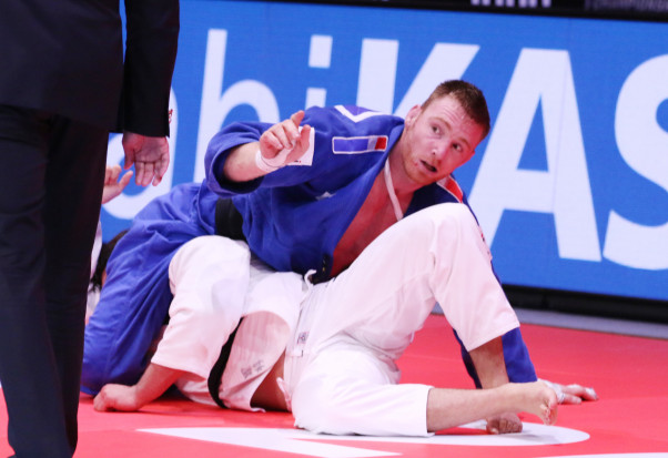 村尾三四郎はクレルジェ(青)の三角絞めでタップ
