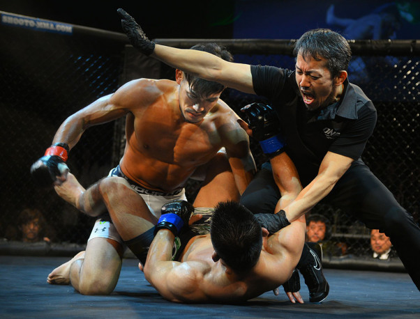 パウンドを連打していく岡野をレフェリーが制止した瞬間