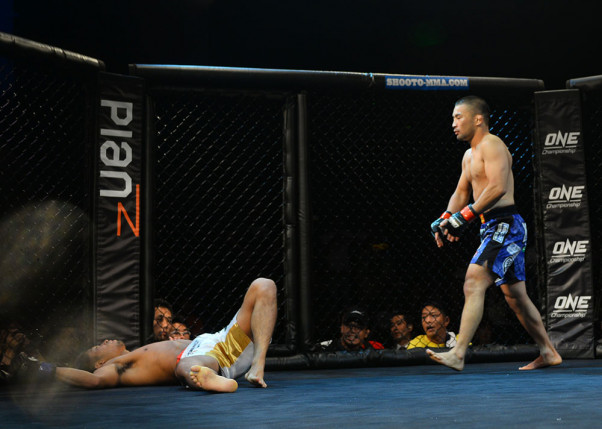 清水の左フック一撃で仰向けにダウンし動けない秋葉