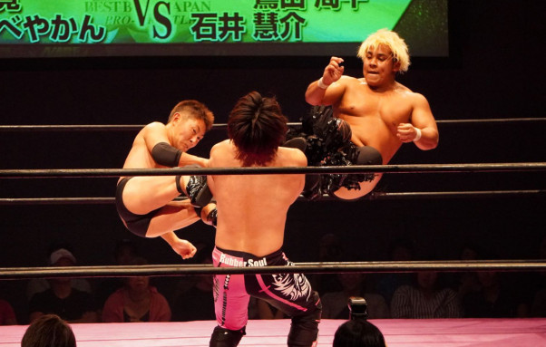 Wドロップキックを見舞う島谷となべやかん