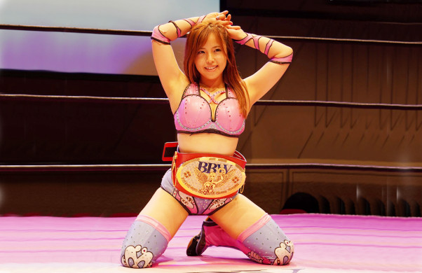 初代ベルトを巻き、恒例のグラビアセクシーポーズをする白川未奈