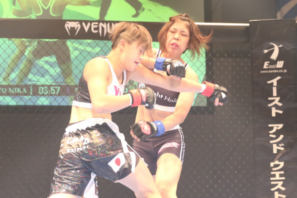 坂本(右)も果敢にパンチで応戦するが古瀬の前進は止まらない