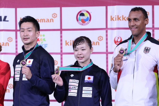 左から84kg級を制した荒賀、女子68kg超級を制した植草、男子84kg超級を制したジョナサン・ホーン(ドイツ)