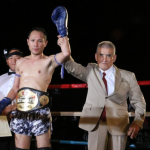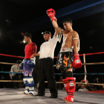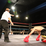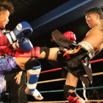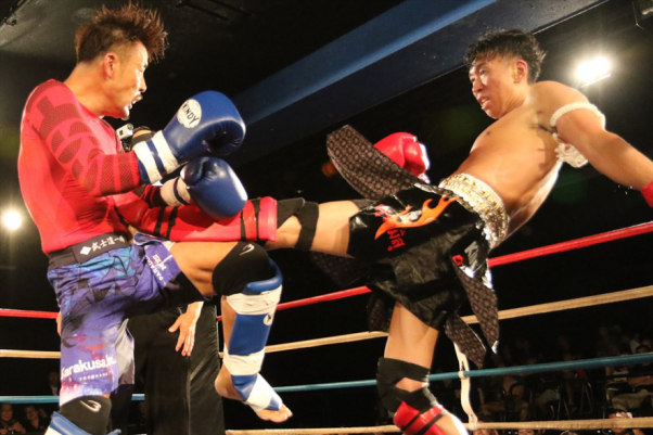 2R Dai(右)の左前蹴りがKIYOSHI(左)のボディにヒット