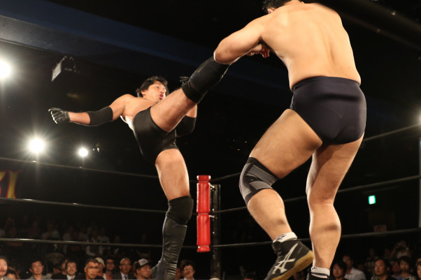 鈴木悟(左)がシュートボクシング仕込みの蹴り技で鈴木秀樹を追い込むかに見えたが……