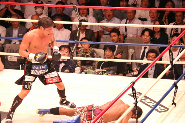 伊藤のフィニッシュの右で前のめりにダウンするマナカネ