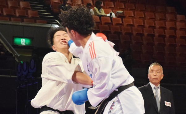 プロボクシングでも実績のある正道会館姫路支部の樫村公治が延長で上段突きを入れ勝利