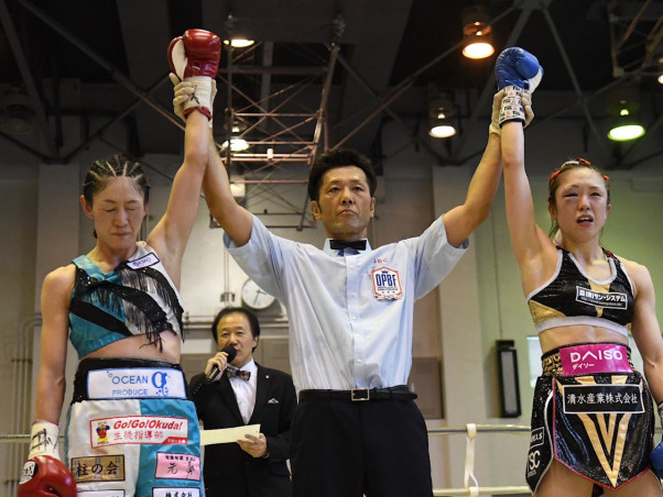 判定はドロー。奥田(左)の強打で谷山の右目が大きく腫れている