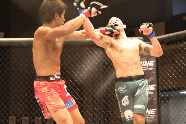 安藤(右)の変則的な右アッパーに岡田は苦しめられ、終盤には鼻血も出した