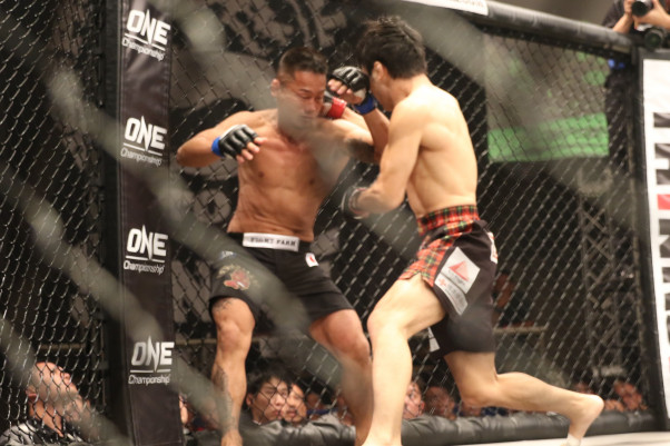 フィニッシュとなった斎藤の右フック、この後高谷は崩れ落ちていく