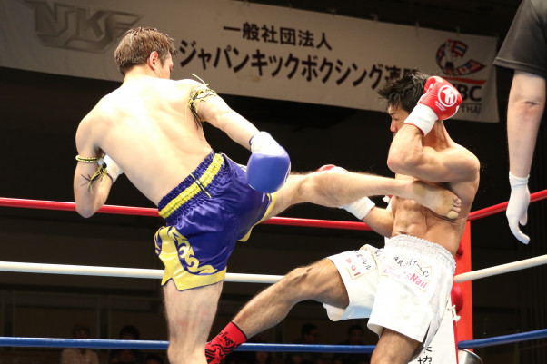 栄基(左)はミドル、テンカオとムエタイ仕込みの蹴り技を散らして畠山を攻める