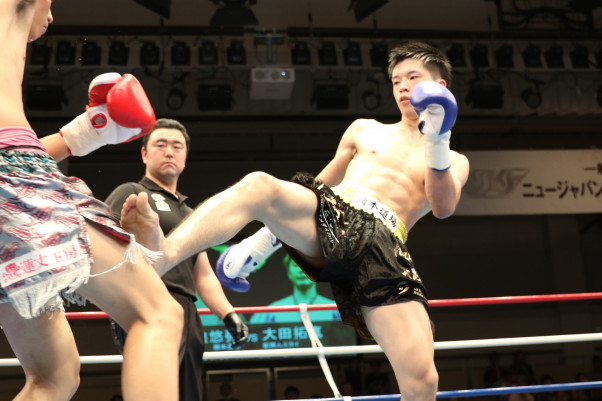 岩浪(右)は橋本道場仕込みの右ミドルで大田のボディを何度もとらえる