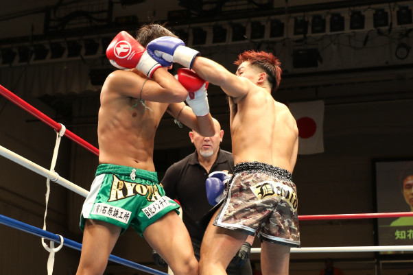 知花(右)は豪快なパンチで馬渡を攻めるが決定打を奪えない