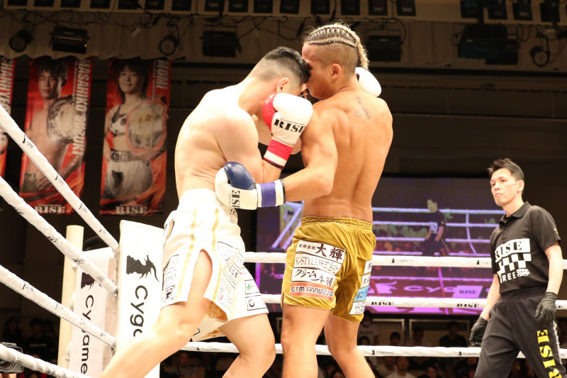 山口(右)は果敢に前進し右ローと左右のボディで山田に迫る