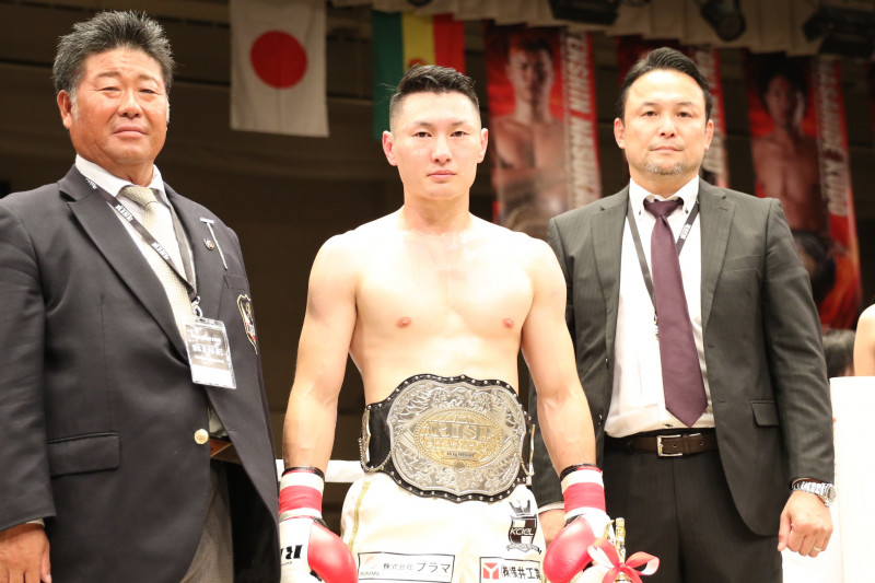スーパーライト級のベルトを巻いた山田は5月に結婚した妻の懐妊を発表、元RISEラウンドガールとの告白に会場からはどよめきが