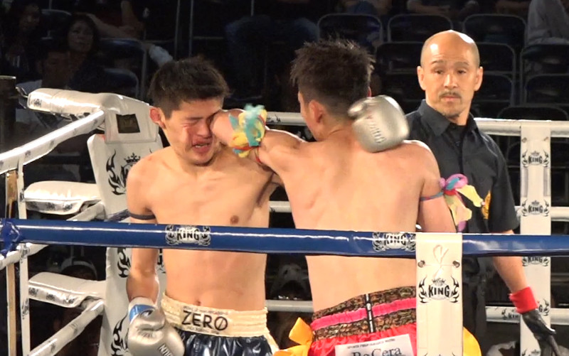 2R終了間際、壱の左肘が誓の左目尻にクリーンヒットした瞬間