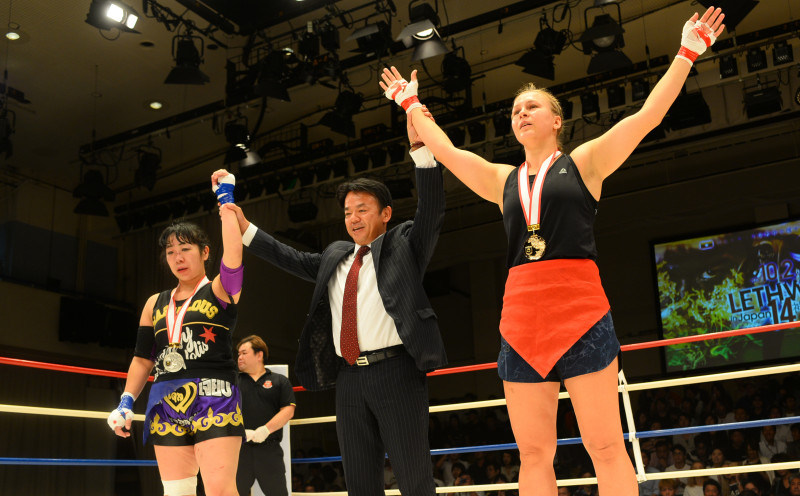 唯我はダウンを喫し、鼻骨骨折の疑いでドクターストップ。ユリアがTKO勝利した。