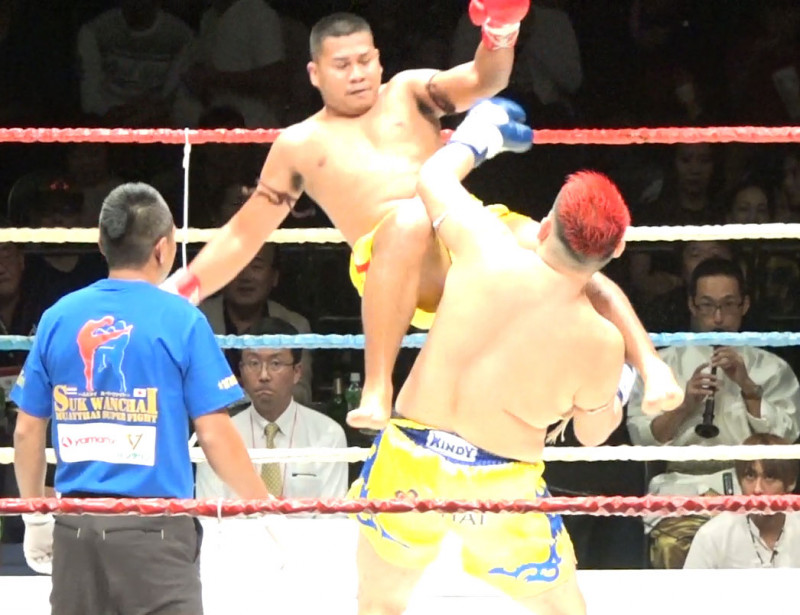 アーミン(奥)の飛びヒザによる急襲も実方は落ち着いて対処