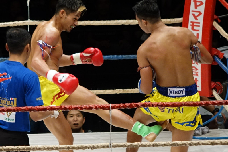 匡志(左)はローキックでペットワンロップにダメージを与えるがわずかに及ばず
