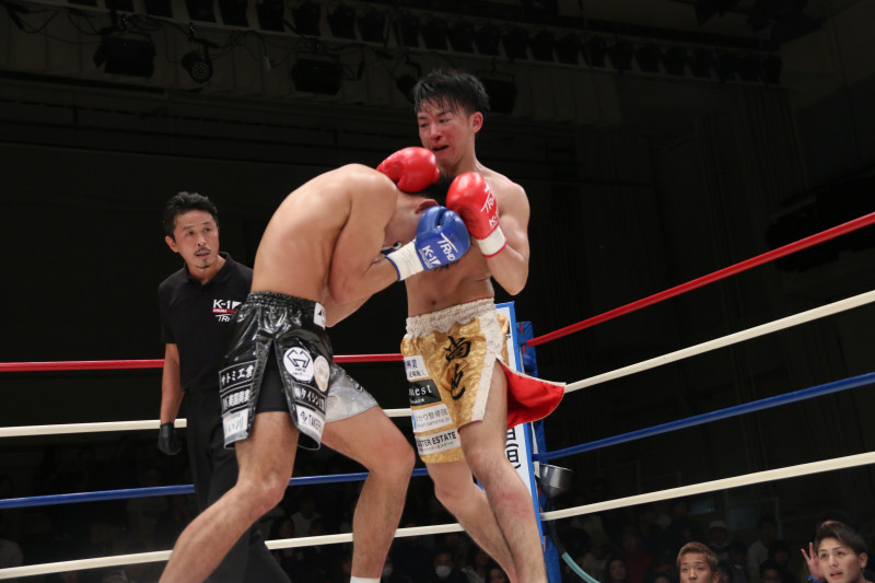 血だらけになりながらも、パンチを振るう小倉(右)
