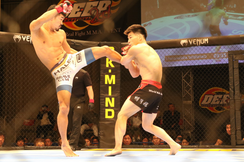 元DEEP王者・芦田(左)は蹴り技も織り交ぜた打撃で長倉を攻め立てる
