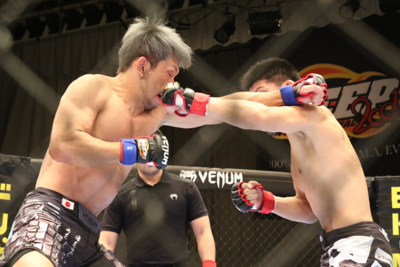 小見川(右)と毛利(左)の40代同士の戦いは壮絶な打撃戦へ