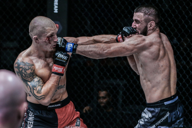 ガデスタム(左)は4Rにアバゾフのヒザを受け右目じりをカット