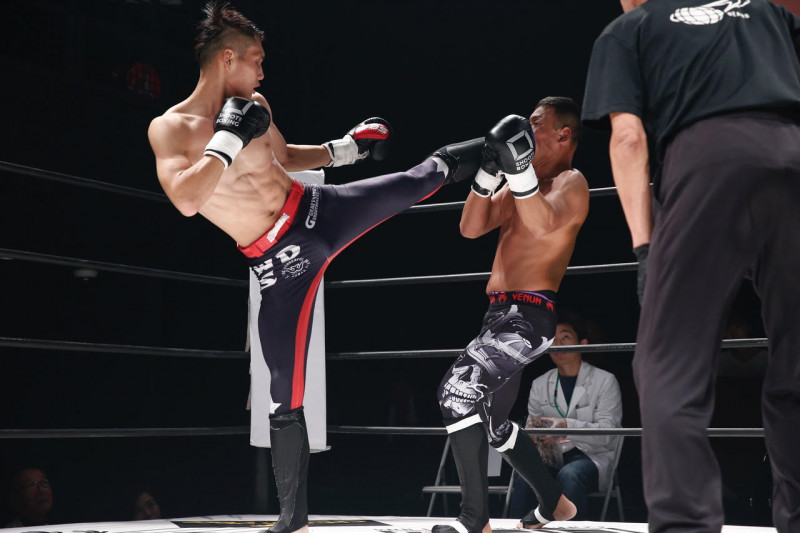 佐達(右)から左ハイキックでダウンを奪うイモト(左)