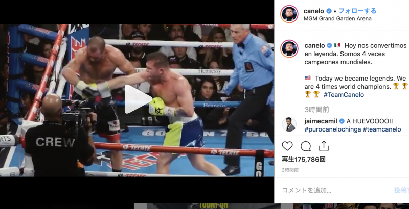 今回KOシーンの動画と共に「我々はレジェンドとなった」と綴ったアルバレスのSNS