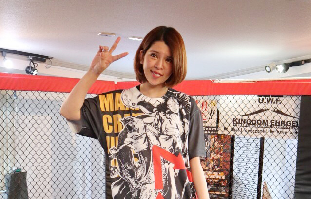 金網の中でピースサインする坂口