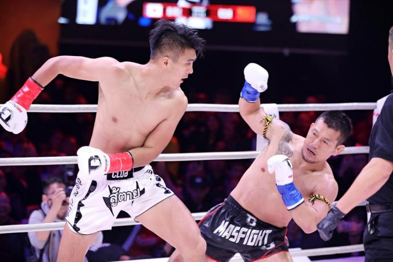 バオトンの左フックでダウンを奪われるTOMOYUKI(右)