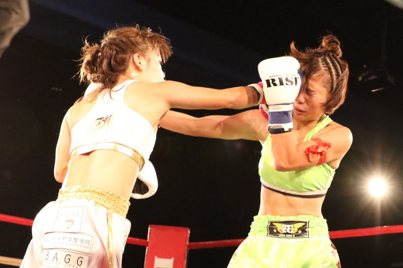 中盤から圧力を強めた平岡(左)は再三にわたりパンチを佐藤に打ち込む