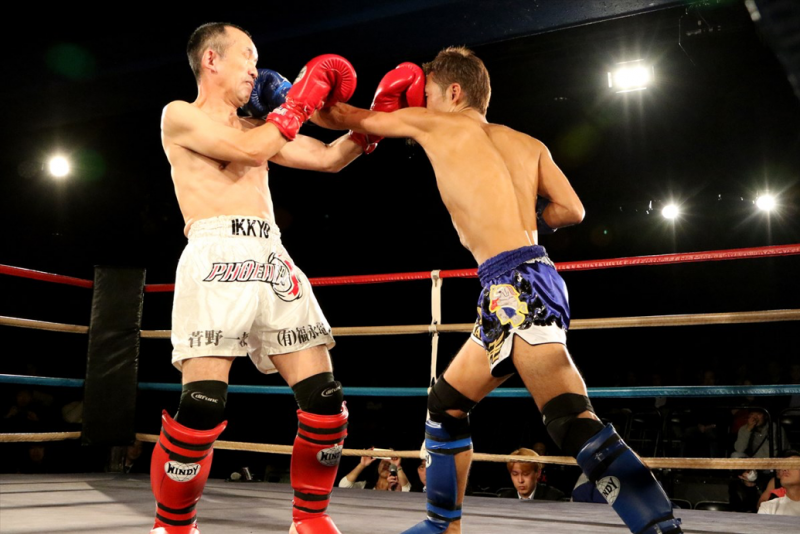 1R 深見(右)の左ストレートが菅野(左)のアゴにヒット